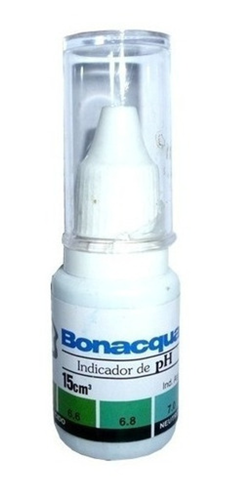 Instrucciones: Llene la mitad del tubo (5cm3) con agua del acuario. Vierta dos gotitas de Bonacqua indicador de pH. *Compare el resultado (color) con la tabla del envase