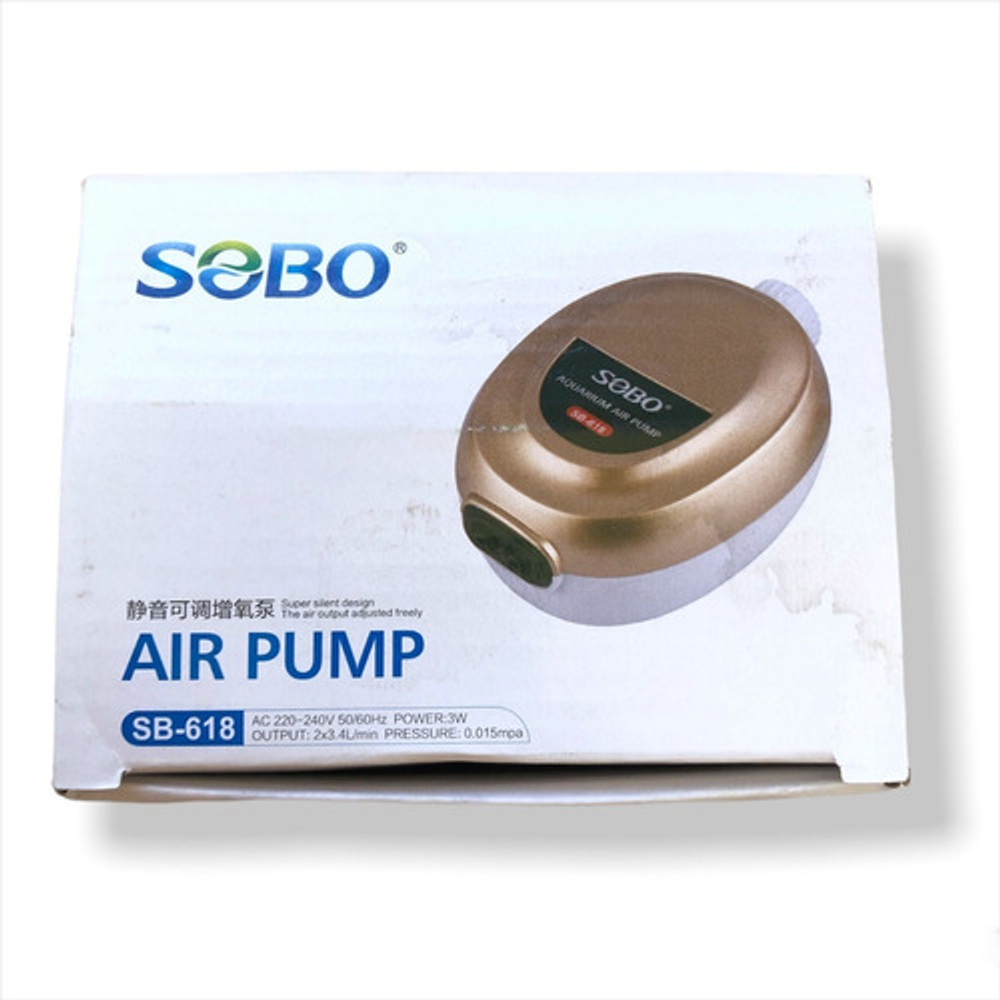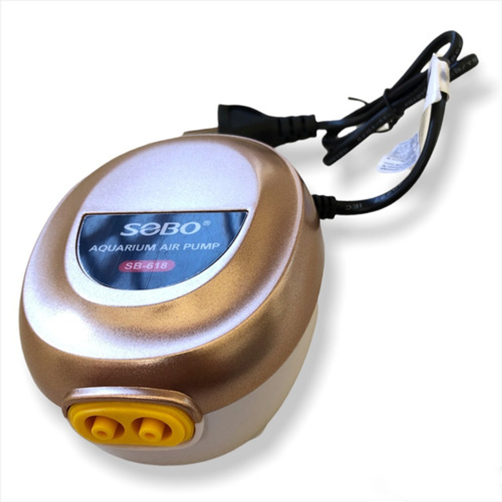 Aireador para acuario. Marca: Sobo. Modelo: SB-618 ac Potencia de 3W Salida: 2 X 3.4 litros por minuto. Diseño interno único de la estructura, funcionamiento silencioso. Usando pies especiales a prueba de golpes, la vibración es extremadamente pequeña. Rendimiento estable, seguro y fiable. Una salida y una velocidad. El aireador permite mantener el acuario oxigenado, lo que es fundamental para la supervivencia de los peces.