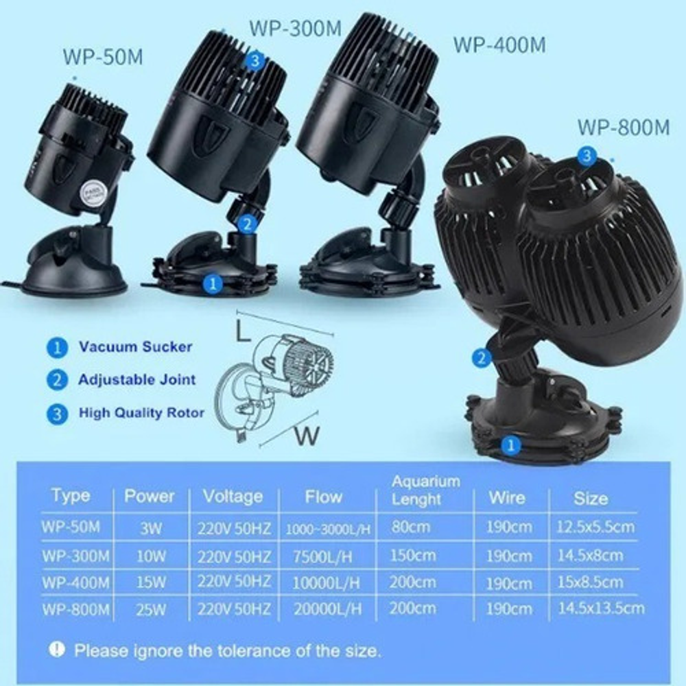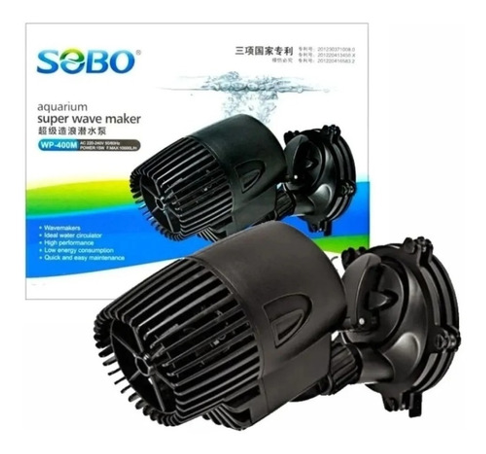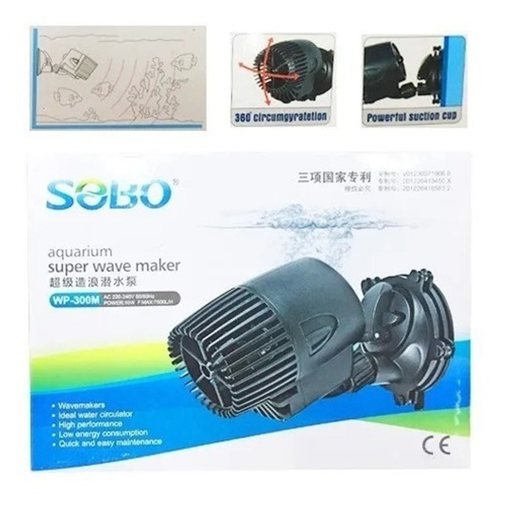 SoBo Super Wave maker Circulador de agua ideal / Alto rendimiento Bajo consumo de energía / Mantenimiento fácil y rápido Importado Excelente Calidad Modelo No - WP-300M CA 220-240V / 10W / F. Máx. 7500 L / H . Útil para reprogramar corrientes naturales en acuarios de agua dulce y marina. Tamaño compacto, dirección ajustable del flujo de agua. Alto rendimiento con el mínimo consumo de energía. Se puede montar fácilmente con su potente ventosa, confiable, extremadamente silenciosa y fácil de mantener.